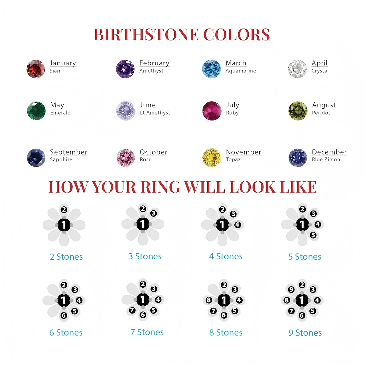 Celebrate the special bond with a stunning Flower birthstone ring, ideal for mothers who deserve your love and appreciation. Customize this meaningful keepsake by selecting 1 mother stone and 1-8 gemstones that represent each family member.