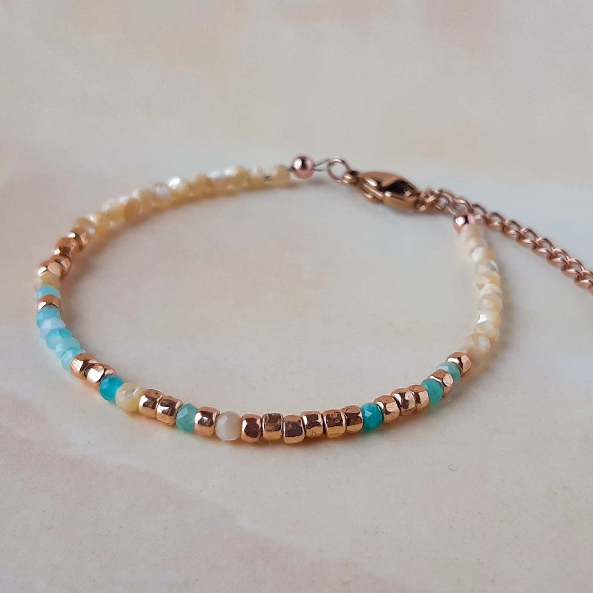 Made of bright colored amazonite gemstones, mother of pearl beads and rose gold accents, a meaningful piece of jewelry that will make a cherished encouragement gift for anyone needing an uplift.
